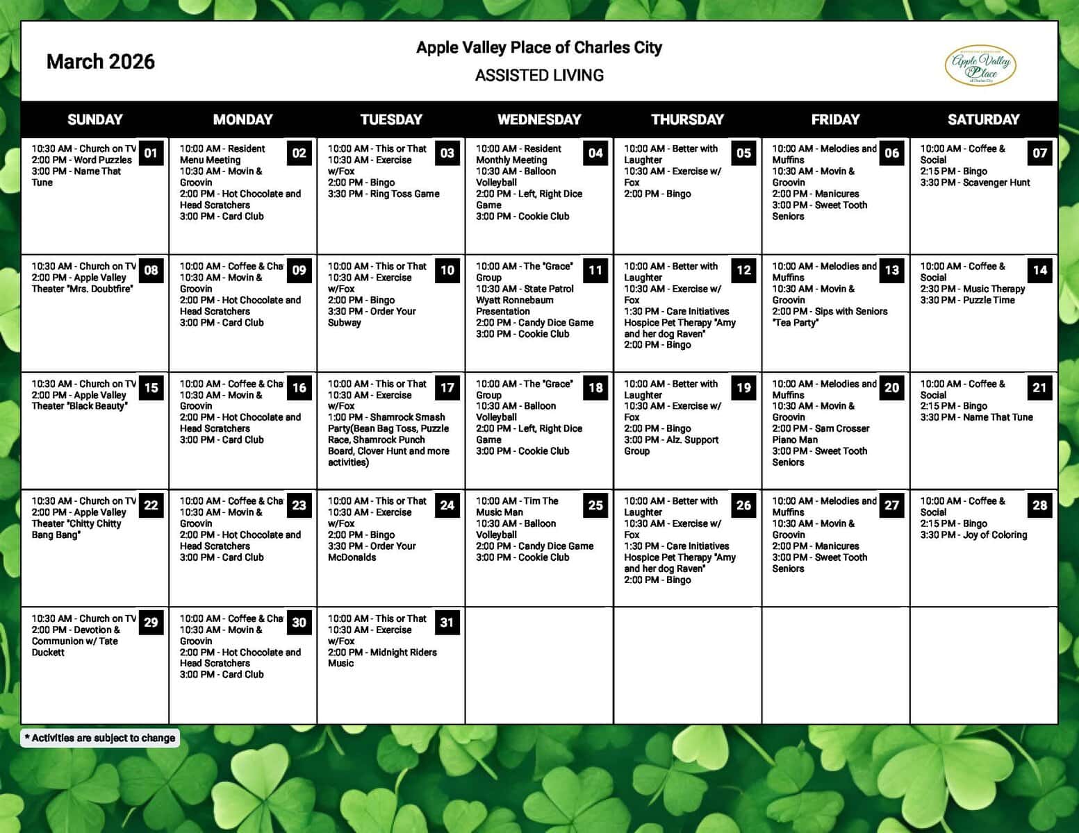 Assisted Living Activity Calendar